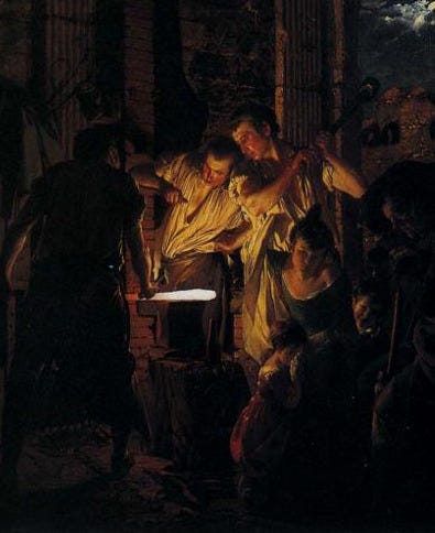 The final two lines are a powerful evocation of Randal in all the magnificence of his physical strength when he worked at the forge. Hopkins’s use of stress to evoke sound is very evident in the final line, with its six strong stresses: Great, Grey, Dray …; Bright, Batt …, Sandal. These are surely two sets of three hammer-blows on the anvil.